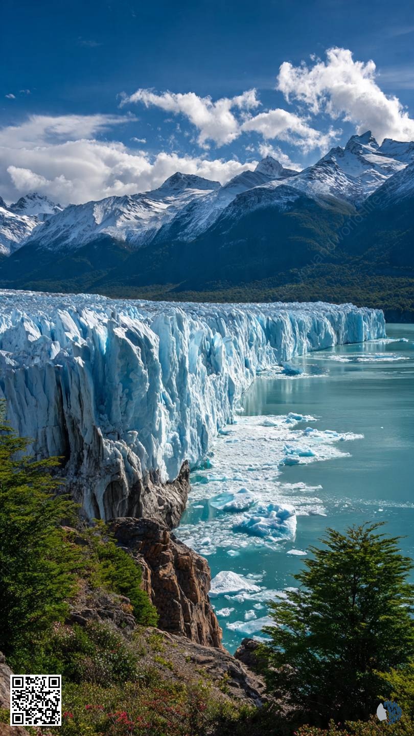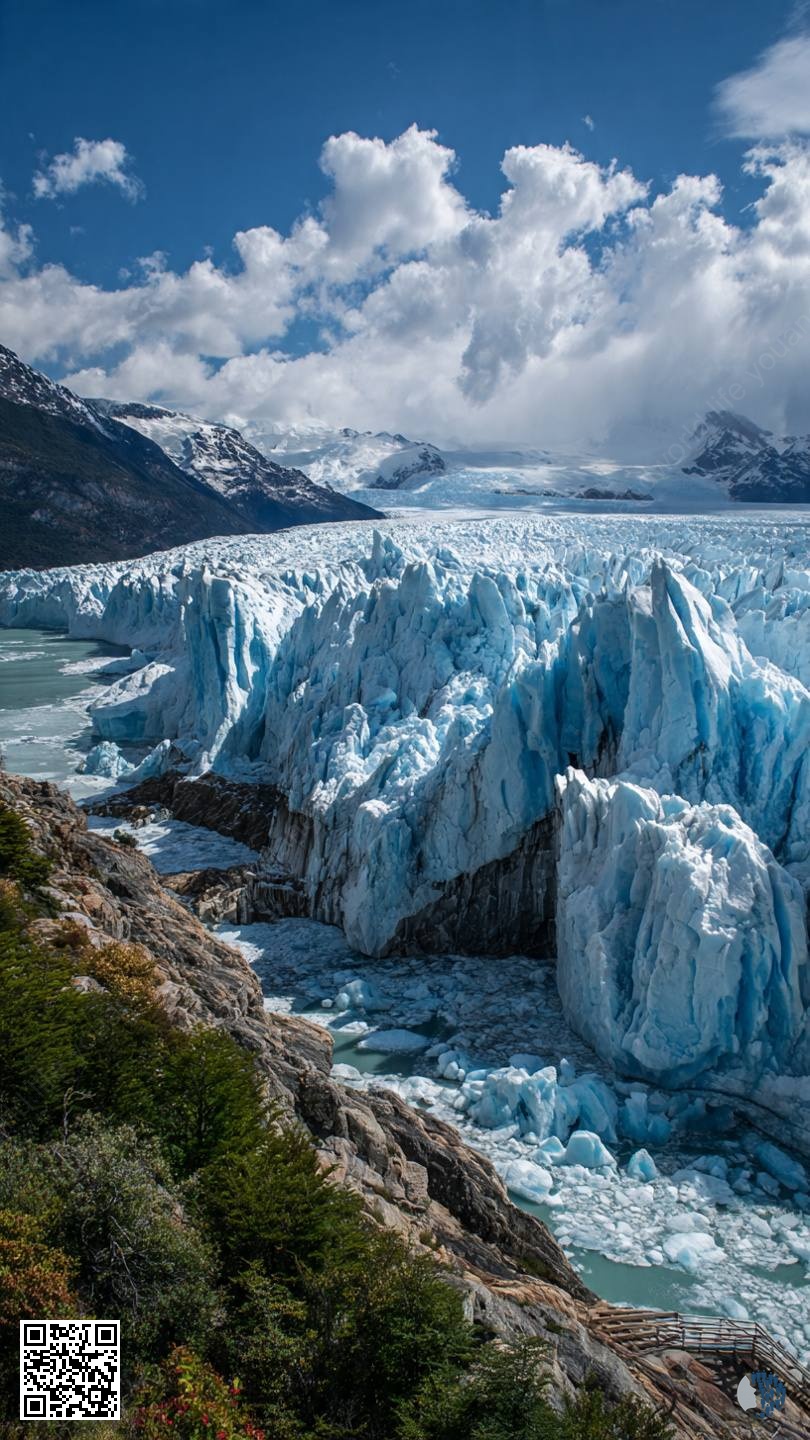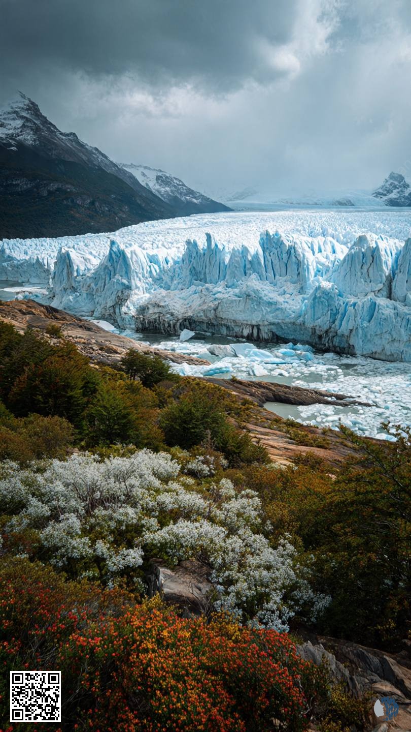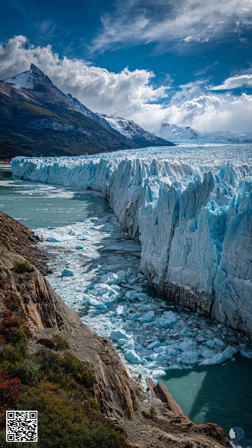 The Perito Moreno Glacier in Patagonia is a magnificent sight, where a gigantic wall of blue ice meets turquoise waters. Like a monumental glacier, it towers over the surrounding landscape, reflecting shades of blue that range from delicate to deep. Dramatic clouds looming over it add contrast and create an atmosphere of grandeur, emphasizing the power of nature.